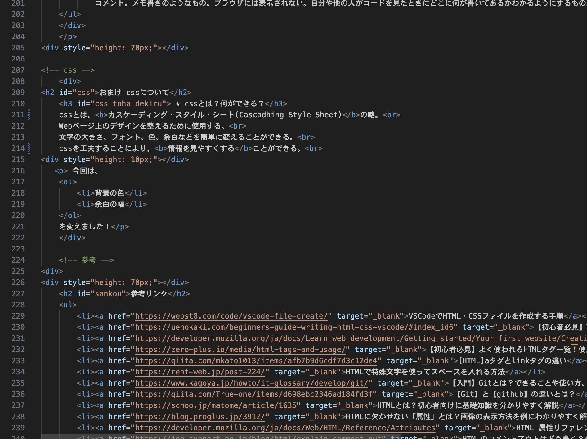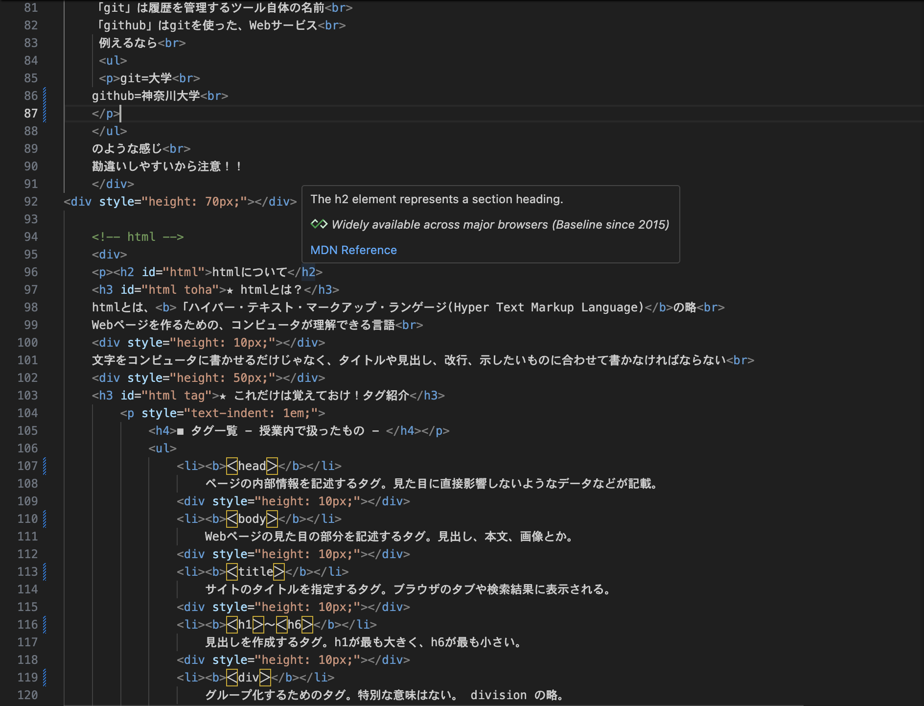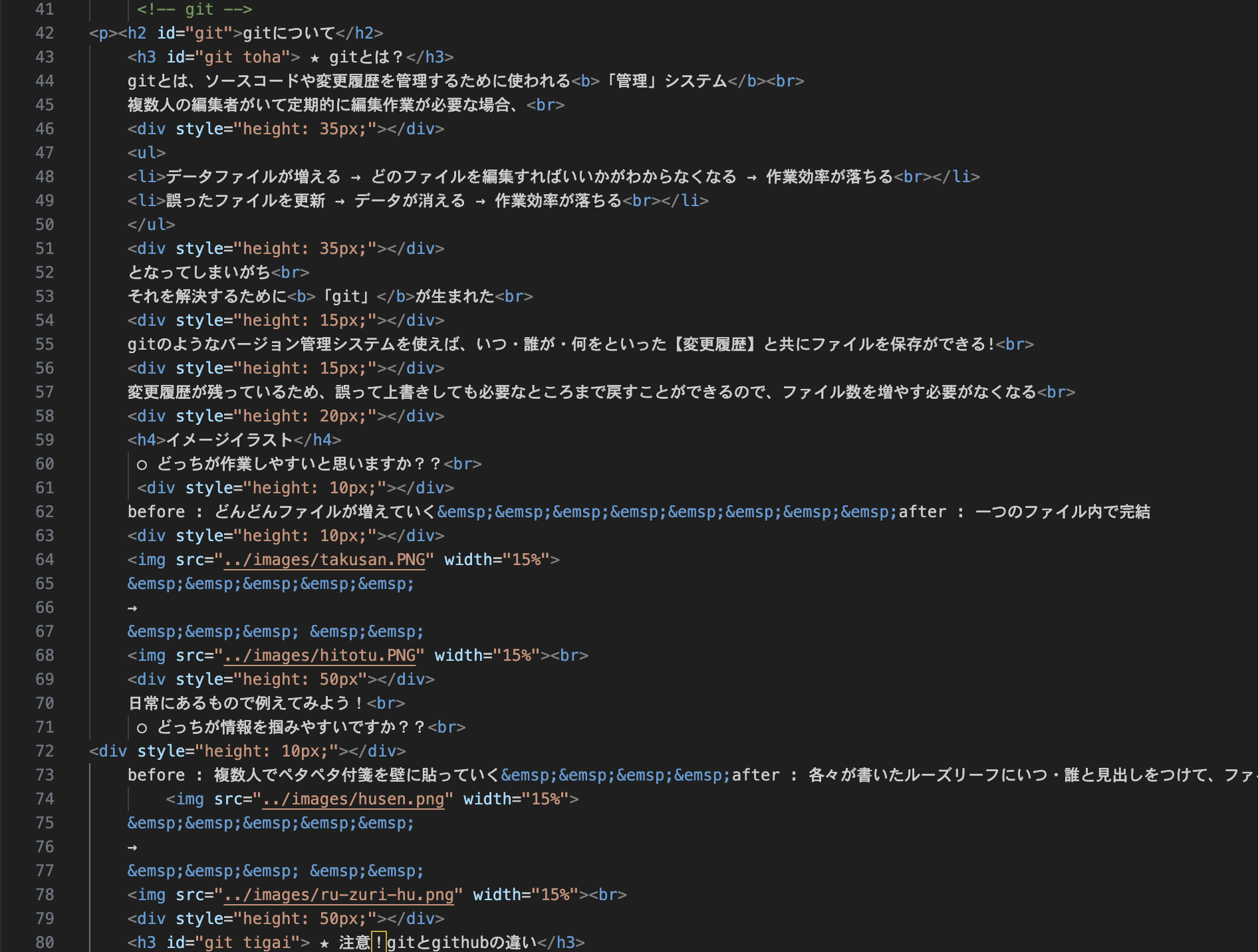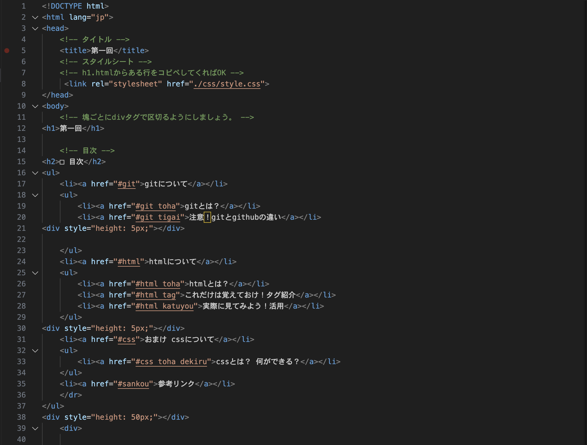 見出しの部分(gitについて、htmlについてなど)に id属性 を使って名前(識別子)を付ける